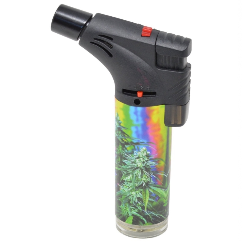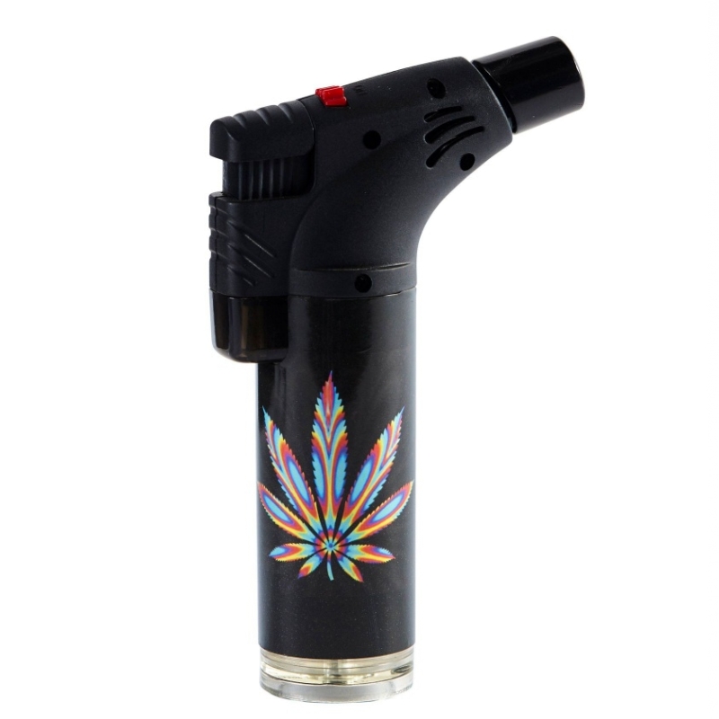 These 4.5 " Slanted Torches with Marijuana Leaf Design are the perfect size to take while traveling on vacation , picnics , camping , and outdoor events as they are windproof. . They come with a flame safety lock and also have an adjustable flame size . Shipped with a display box of 15 pcs in assorted designs and logos . .